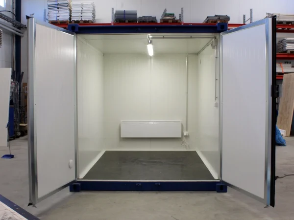 The 10’ insulated container is a very popular storage container for year-round use. The insulation keeps moisture outside, and the radiator ensures that the space is warm year round.  The  container has double doors equipped with an awning, and 2 ventilation valves as standard equipment. An electric supply, heating and access doors are offered as additional equipment. The container is suitable for storage use only, and is only available in new condition.