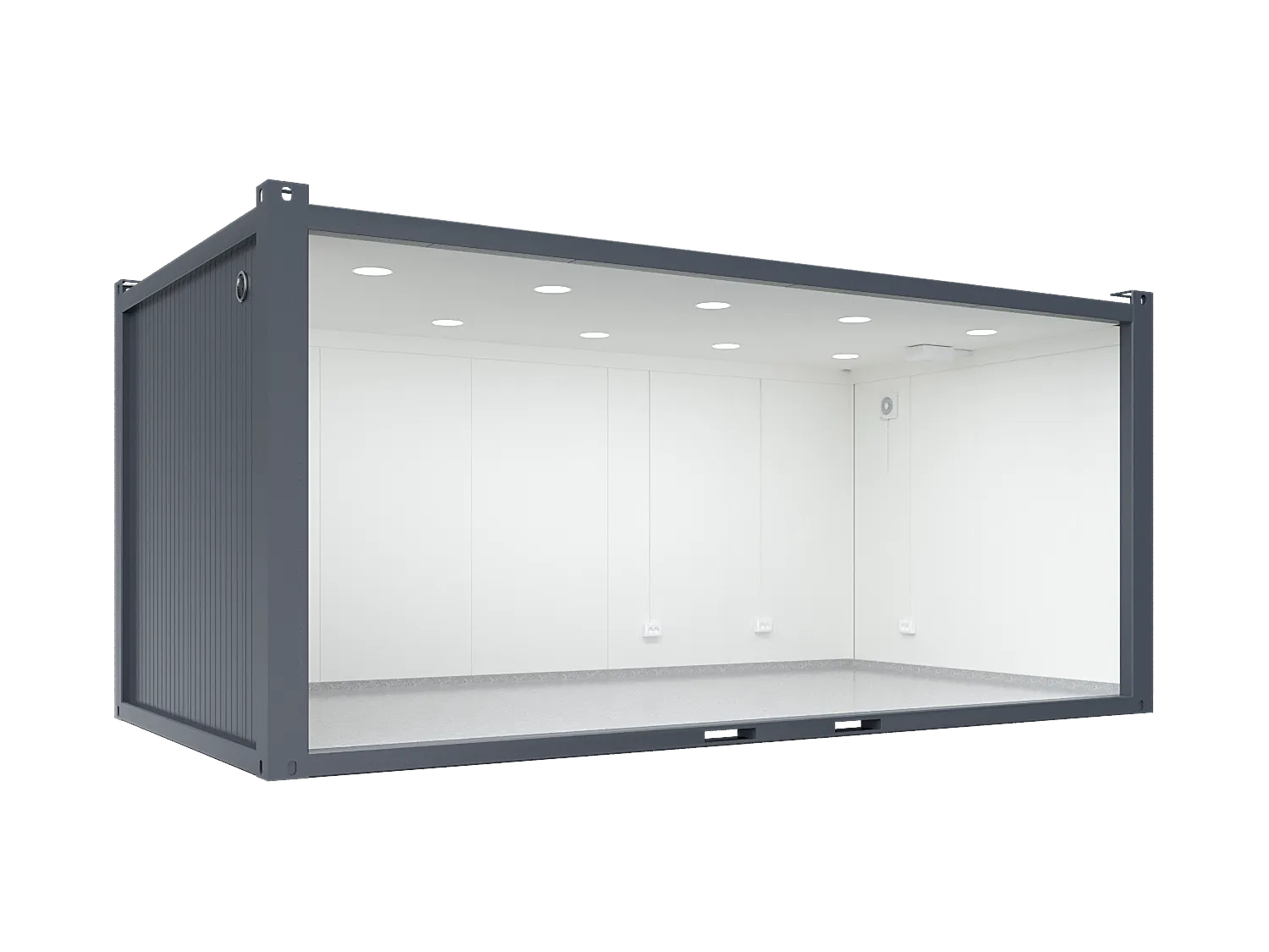 The most popular version of a 6m Glass Container with an inner width of 2990mm. At 18 m², the high-quality Premium class container offers an insulated, heated, and eye-catching multipurpose solution. The long side of the container is made of glass with glass double doors. The container comes with standard equipment of 10 recessed LED lights, radiator, sockets, ventilation and computer plugs. White inner surfaces and the internal height of 2520mm give the container a bright interior compared to low and dark containers. The walls are easy to keep clean as they are made of smooth sheet metal, and the grey vinyl floor is very durable. The container comes in an elegant dark grey (RAL 7024) or light grey (RAL 7035), which is a great fit with a range of situations and events. Office containers can be linked to each other, with the power supplied with a 5-pin, 32A socket, which can also be converted to 16A with an adapter.