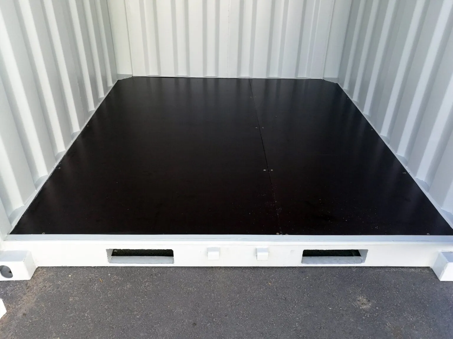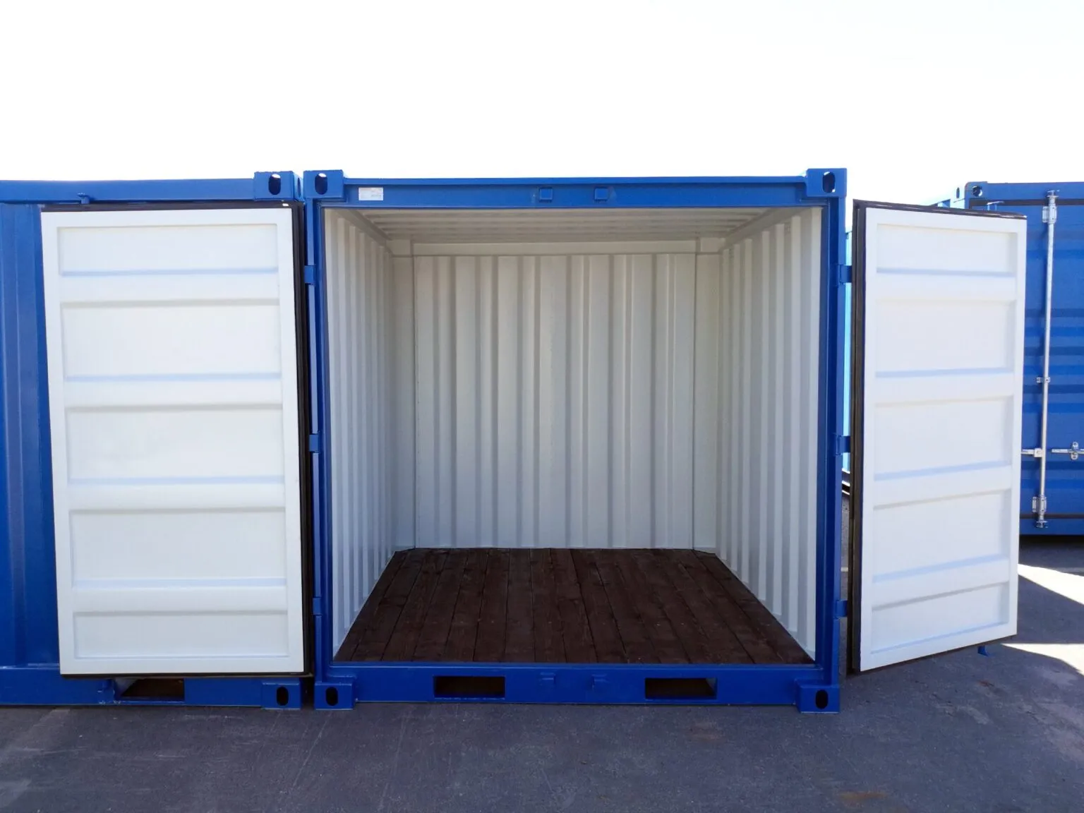 The container has double doors on one side with locking bars. The latch has a protective cover, under which there is an option to add a padlock. Rain-protected IV valves on the walls and forklift pockets on the frame to move the container. The containers come with a standard 25 mm wooden floor. Also available with plywood and steel floors. Accessories such as shelves and lighting are available for the storage container. The container is only suitable for storage use and does not have a CSC plate.