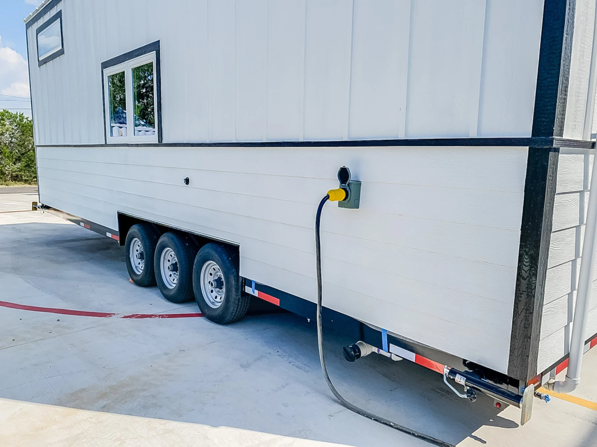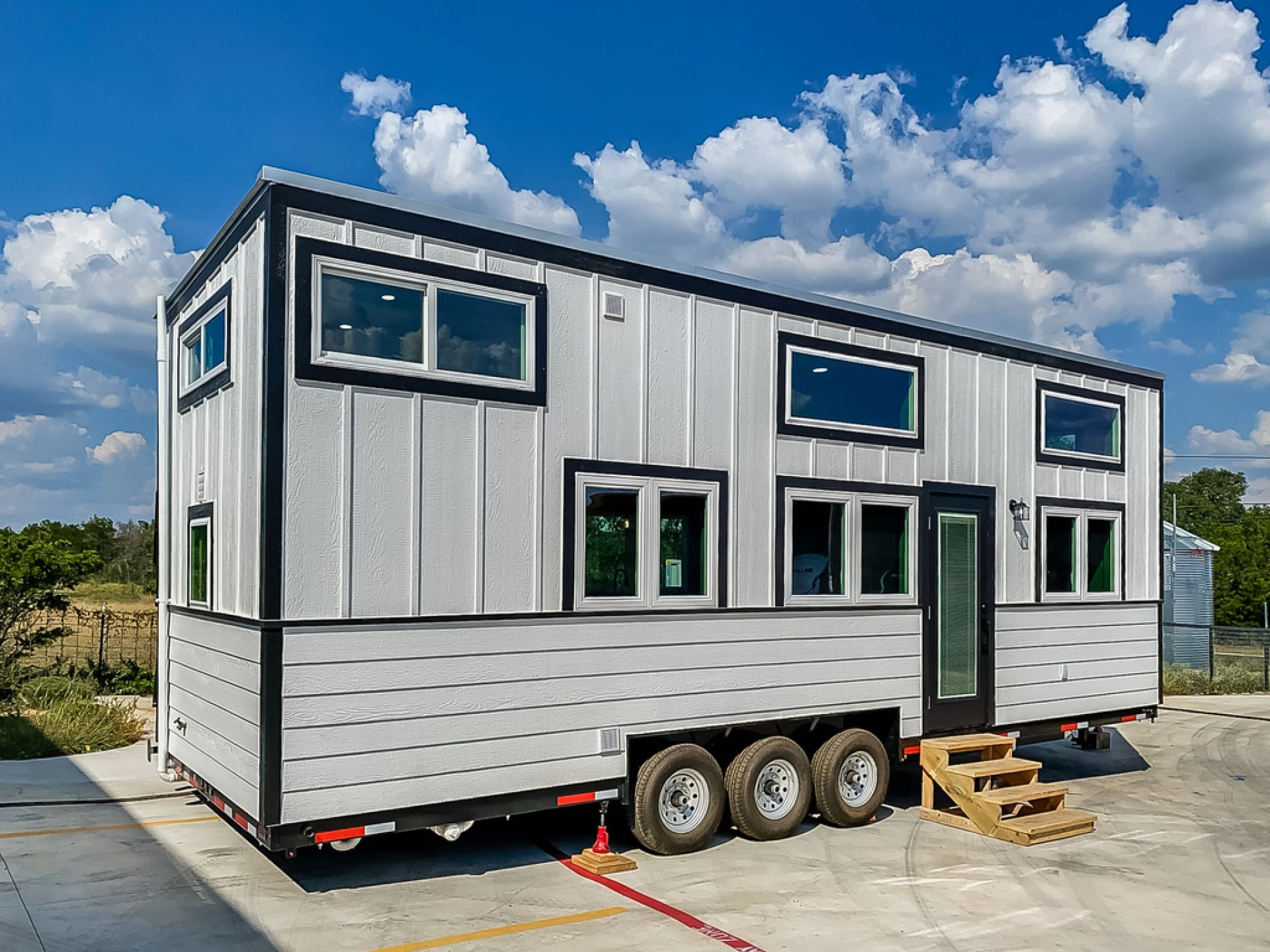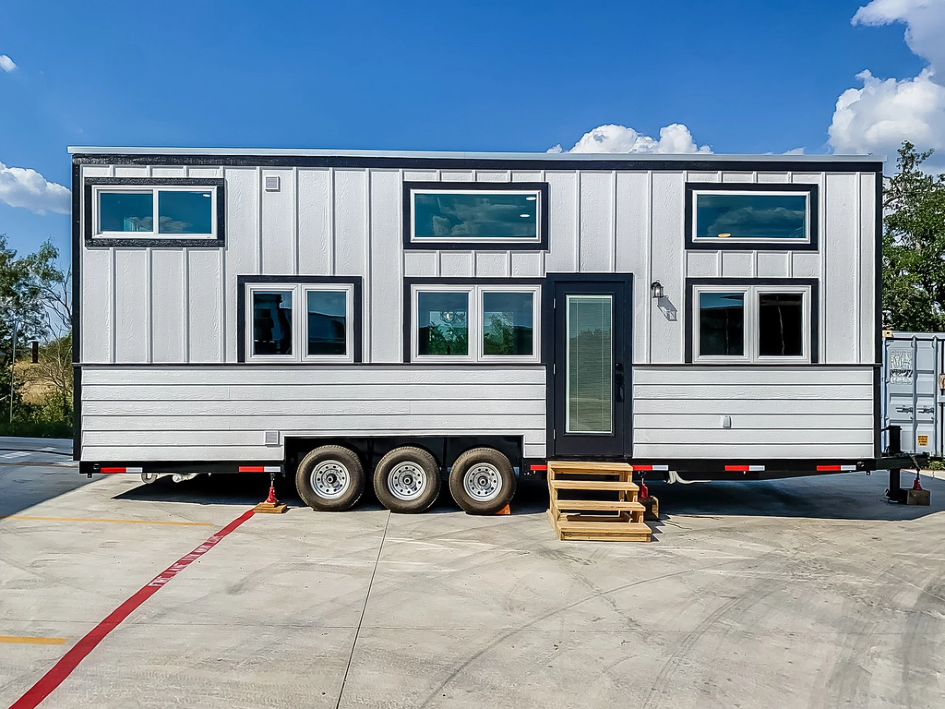 The Camden is based on a triple-axle trailer and is finished in engineered wood siding, with generous glazing and a steel roof. Power comes from a standard RV-style hookup.