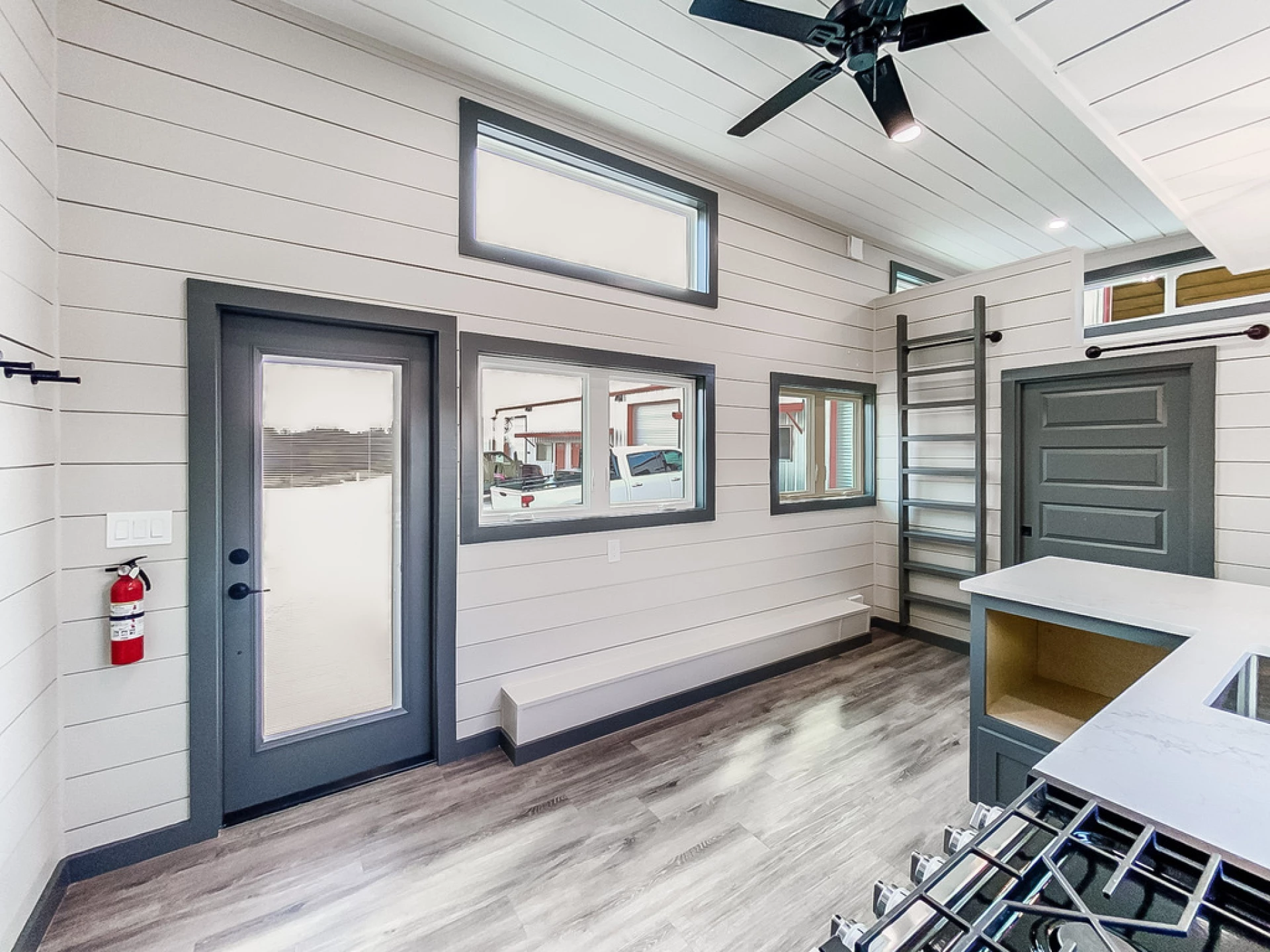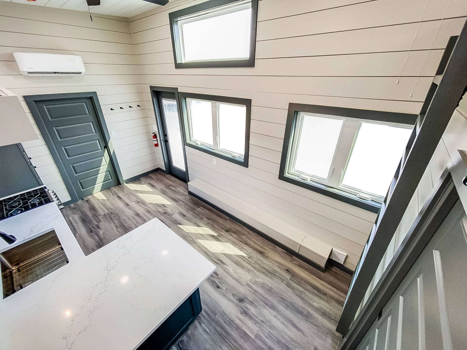 Though it’s not overly long, the Camden tiny house is extra-wide, and this makes all the difference inside. The home’s interior layout takes advantage of the increased space with a storage-heavy design that includes both a master bedroom downstairs and a secondary one up top.