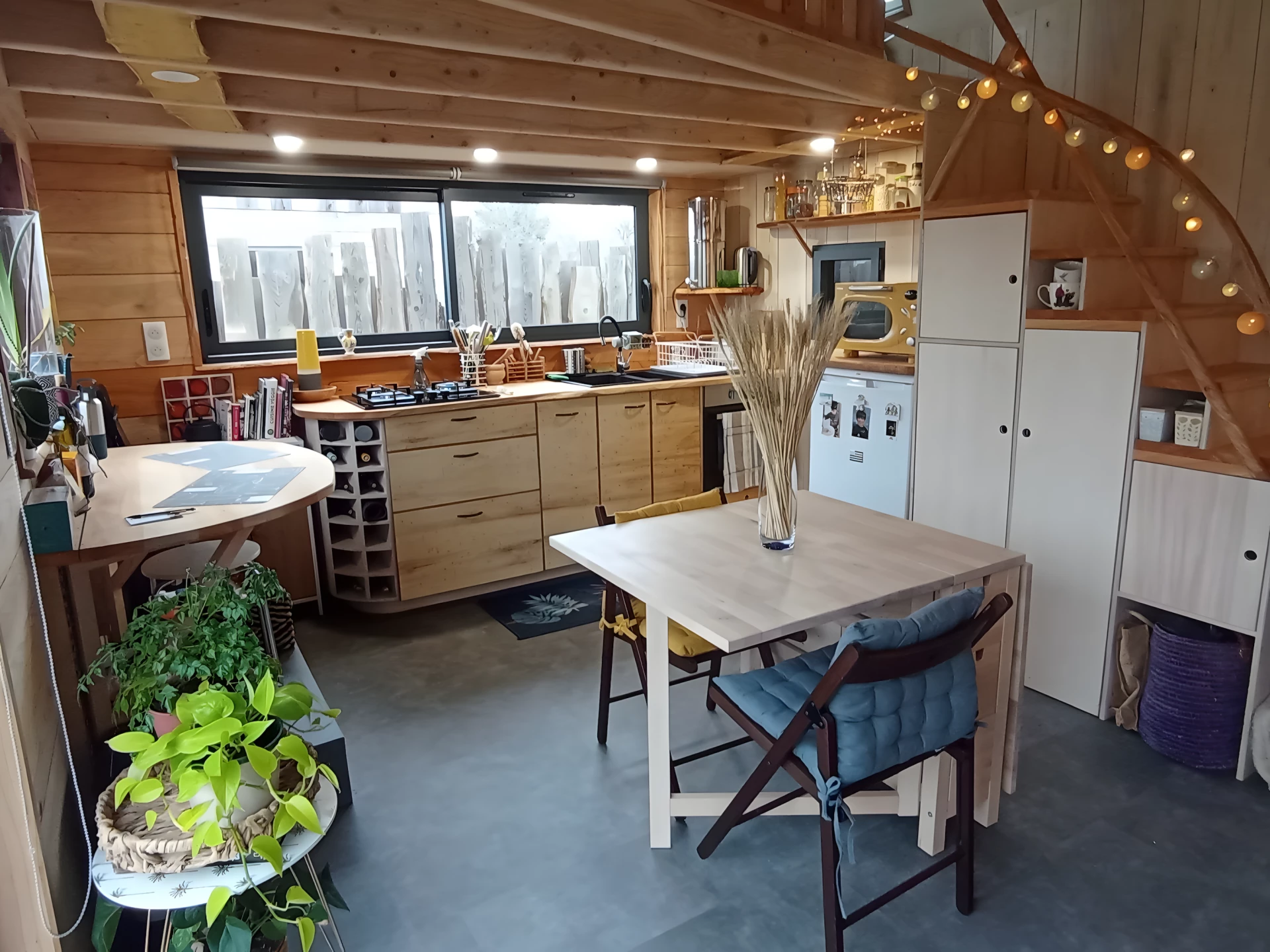 The home measures roughly 40 sq m (430 sq ft) and features a spacious ground floor. This includes a snug living room with an L-shaped sofa, alongside a wood-burning stove. The kitchen is nearby and looks generously proportioned for a tiny house thanks to that extra width. It includes a breakfast bar-style dining area/desk, a dining table, a two-burner propane-powered stove, gas oven, microwave, fridge, and quite a lot of cabinetry, plus the all-important wine rack – this is a French tiny house, after all.