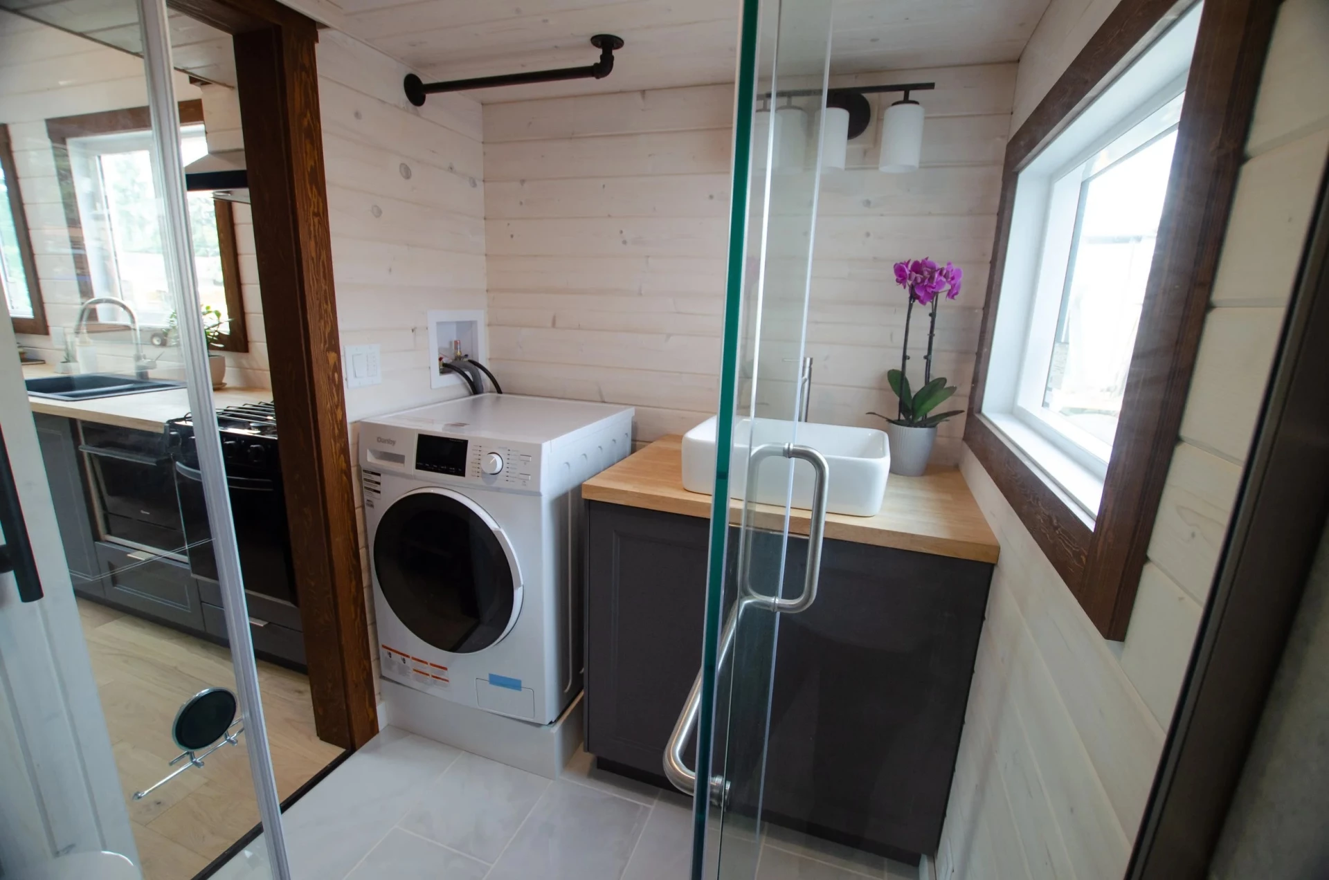 From the kitchen, a sliding barn-style door provides access to the home’s bathroom. This includes a shower, a sink, and a flushing toilet. There’s also a combination washer/dryer installed.